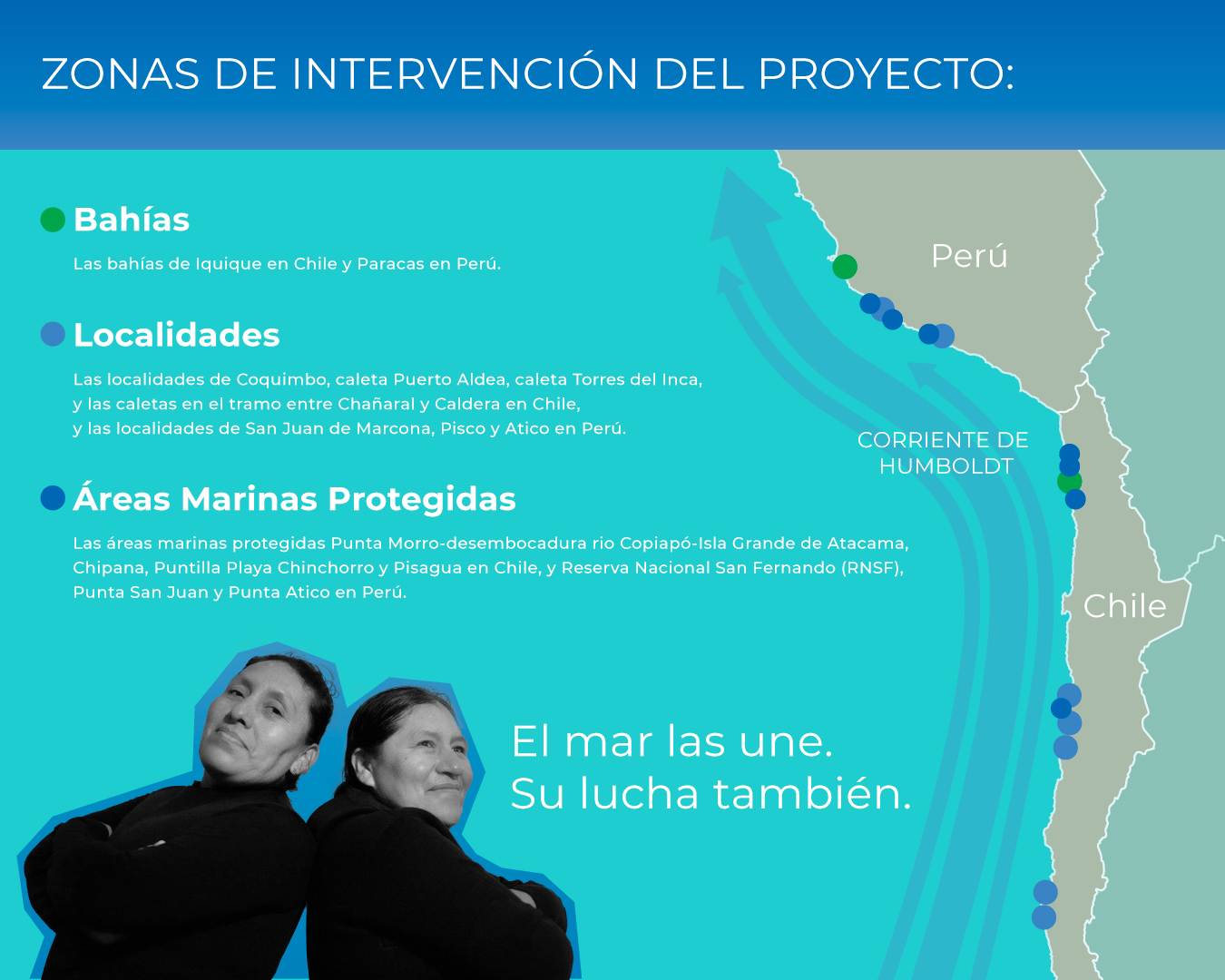 El proyecto Humboldt II está trabajando con las mujeres de comunidades pesqueras artesanales en Chile y Perú para ampliar y mejorar sus conocimientos en gestión y liderazgo, robustecer sus oportunidades para generar ingresos y promover su empoderamiento económico. De esta manera, el proyecto fomenta su inclusión en roles de liderazgo y en la toma de decisiones dentro de las organizaciones pesqueras. A la par, el proyecto busca promover redes de aprendizaje e intercambio de experiencias entre mujeres de ambos países.